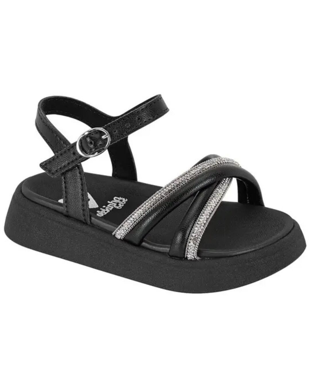 A Sandália Molekinha Infantil Preta com Brilho é a escolha perfeita para meninas que adoram estilo, conforto e praticidade. Com design moderno, o modelo conta com tiras cruzadas adornadas por aplicações brilhantes, trazendo delicadeza e sofisticação ao visual infantil.