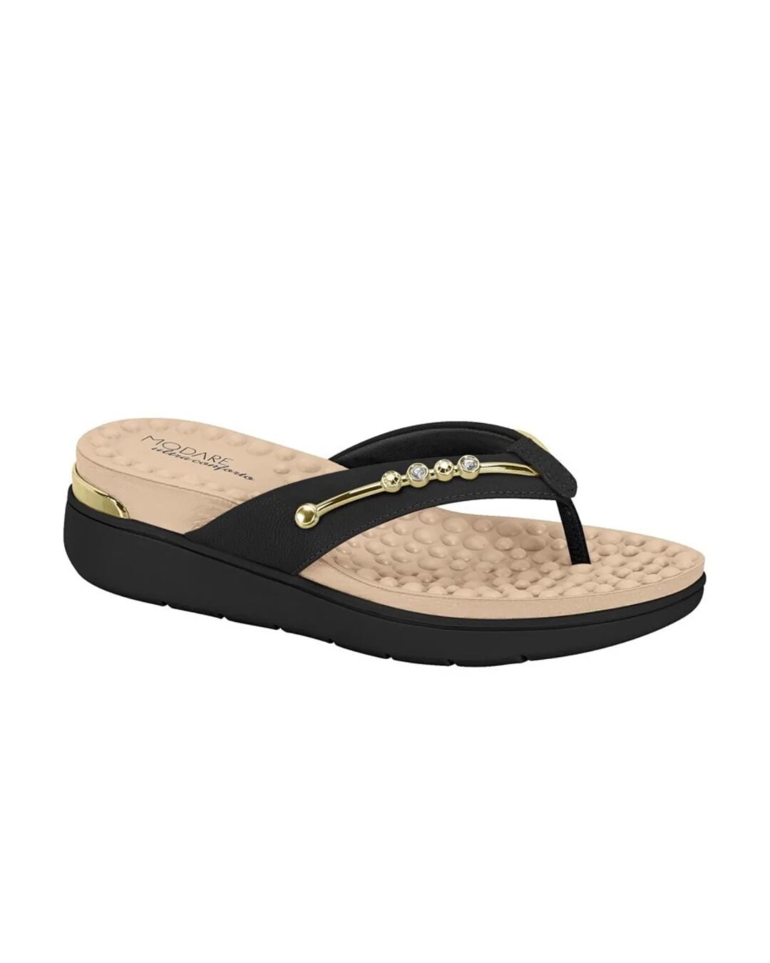 Desenvolvido para oferecer máximo conforto, ele conta com palmilha anatômica massageadora que estimula a circulação e reduz o impacto ao caminhar. Seu design sofisticado apresenta tiras pretas com aplicação de pedrarias e detalhe metalizado dourado, agregando charme e modernidade ao visual.